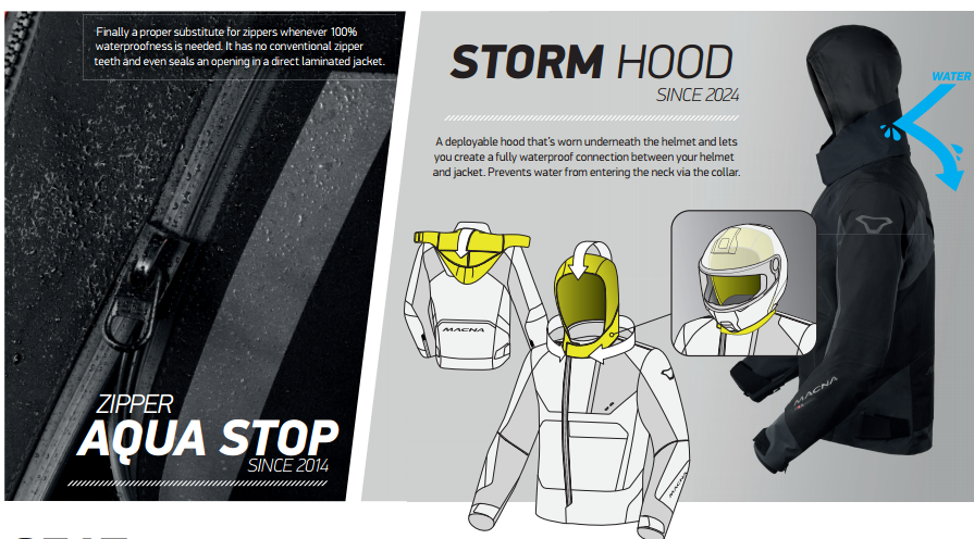 Jakai ir arī izvelkama kapuce, ko valkā zem ķiveres un kas ļauj izveidot pilnībā ūdensnecaurlaidīgu savienojumu starp ķiveri un jaku. Storm kapuce neļauj ūdenim iekļūt jakā caur apkakli.